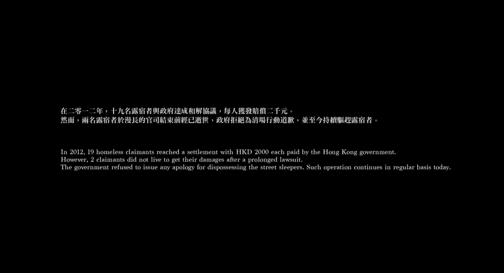 这些年他们的生存状况并没有得到改善。电影只留下黑屏里的一串字幕:2012年,19名露宿者与政府达成和解协议,每人获发赔偿两千元。然而,两名露宿者于漫长的官司结束前已经逝世,政府拒绝为清场行为道歉,并至今持续驱赶露宿者。