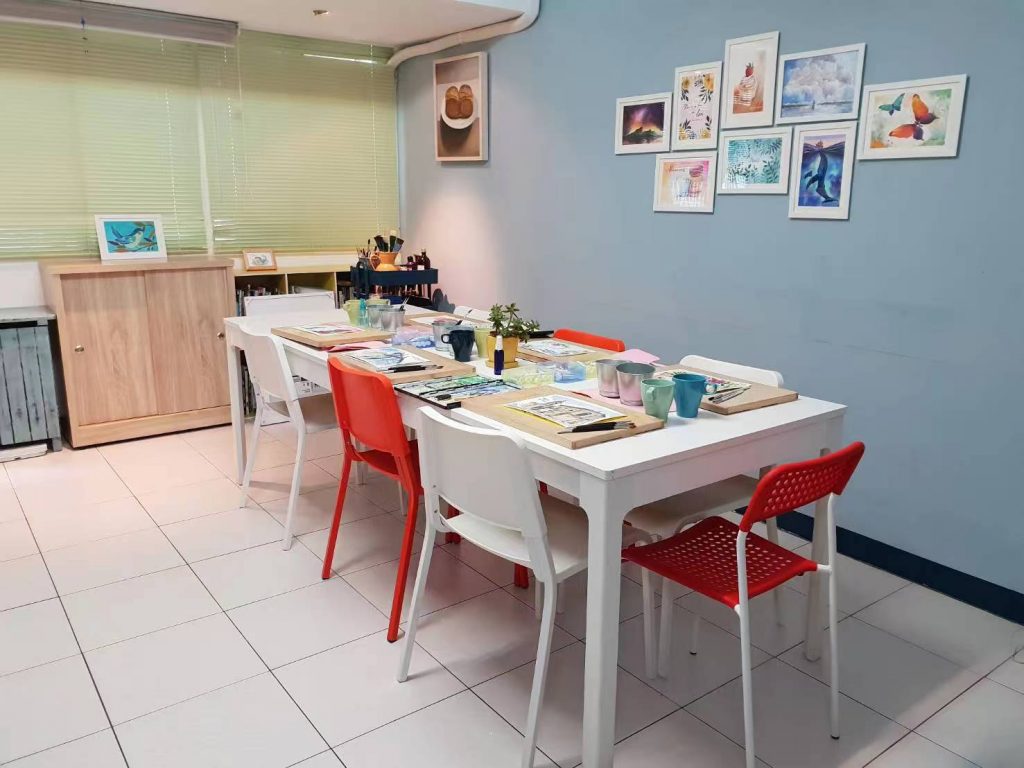 IKEA白色大桌子,长240公分,宽90公分,桌上摆满了各式各样的画具材料。一个大长桌最多可以坐到十个学生,一周至少有两次授课;热闹的课程结束,整个大桌子就是我们可运用的空间。老爷坐在左边,我坐在右边,这是我们最舒服的距离。