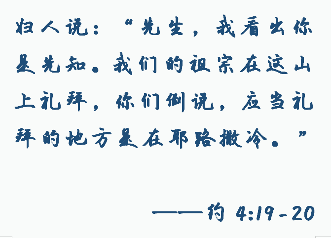 其实,耶稣与人对话,时常出现类似令人费解的事,比如尼哥底母夜访耶稣,客客气气尊称耶稣为夫子,但耶稣却直指他的问题“人若不重生就不能进神的国”。可见,令人困惑费解之处常是真理和亮光的藏身之处。那么,这位妇人转移话题的秘密到底是什么呢?