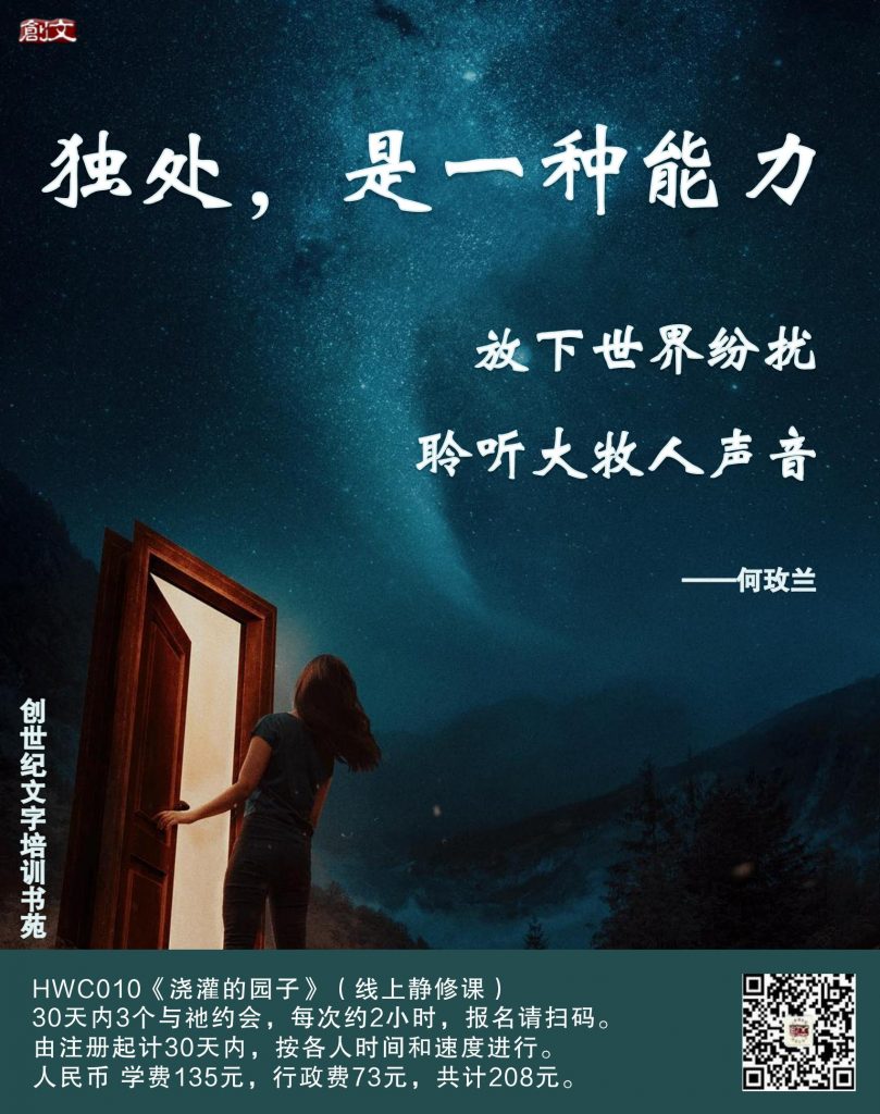 独处,是一种能力。放下世界纷扰,聆听大牧人声音。欢迎查看文末海报,了解HWC010《浇灌的园子》(线上静修课)。