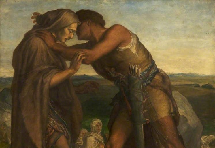 当太阳在东边的天空中渐渐升起时,雅各的妻子带着孩子看到雅各从雅博渡口走来,一瘸一瘸地。他的身影已经够狼狈了,但走近一看,更狼狈的是他的衣装又脏又破烂,脸上有青有紫,头发凌乱。雅各看起来就像一个刚从战场上打败仗归回的战士。
