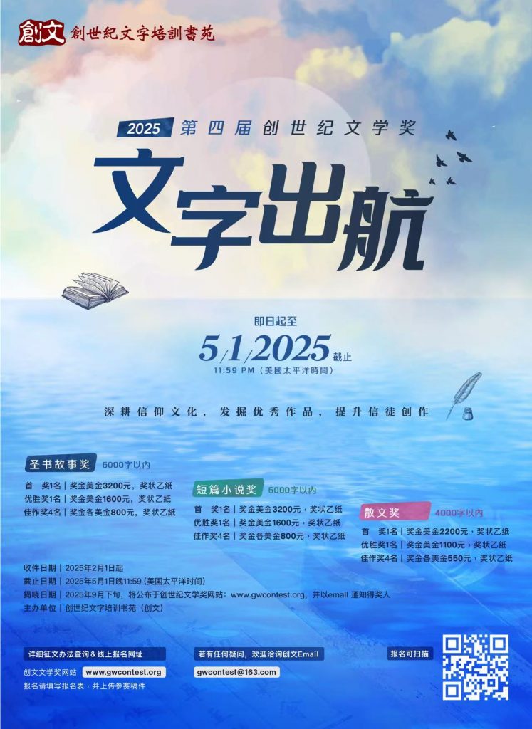 第四届“创世纪文学奖”征文大赛已开启,欢迎您参赛圣书故事奖,描摹奇妙救赎故事。
