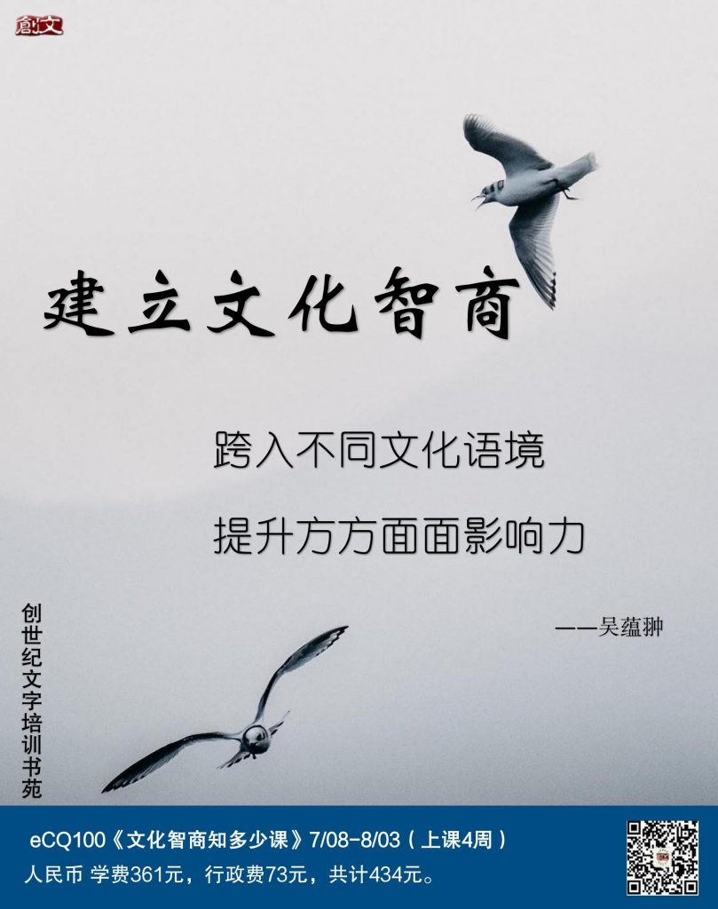 建立文化智商,跨入不同文化语境,提升方方面面影响力。欢迎查看文末海报,了解eCQ100《文化智商知多少课》。
