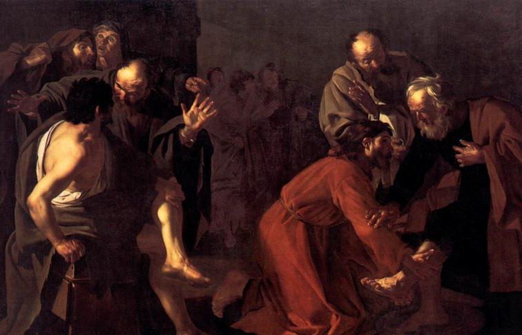 耶稣被钉十字架的前一晚,有很多事同时发生。首先他知道自己离世归父的日子近了(约13:1);然后知道魔鬼已入了犹大的心(约13:2),现在箭在弦上不得不发;可是祂又爱世人爱到底(约13:1),于是做了一件象征性的事,祂取了奴仆的样式,逐一替门徒洗脚(约13:4-5)。