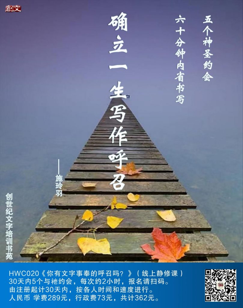 五个神圣约会,六十分钟内省书写,确立一生写作呼召。欢迎查看文末海报,了解HWC020《你有文字侍奉的呼召吗?》(线上静修课)。