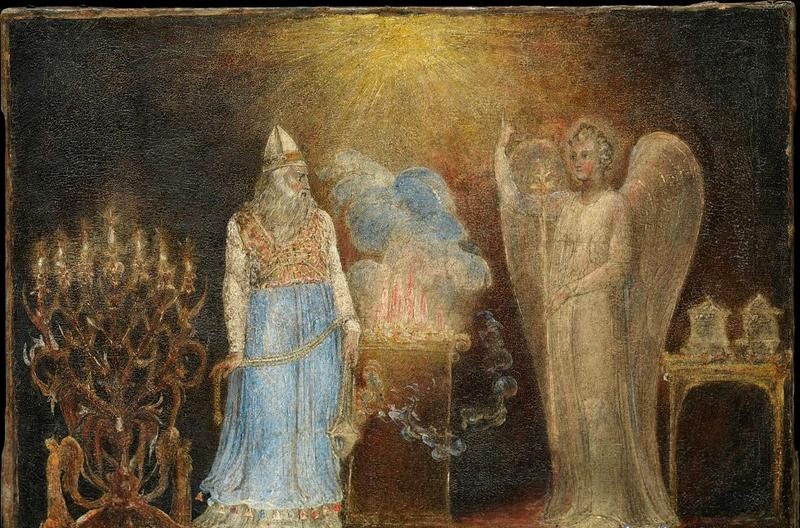 撒迦利亚和妻子伊丽莎白是一对敬虔的夫妇,唯一的缺憾是没有孩子,他们为此祷告多年而不得。虽然如此,他们仍然敬虔服侍。那天轮到撒迦利亚进入圣殿上香祷告。这是一件神圣的服侍,因在这一天,他有面对面与天父交谈的机会,他也能代表以色列人把祈求带到天父的面前。