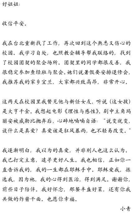小青话少,教会招待问候她,她鲜少搭腔,但双眼总像是在观察什么。去了几次之后,她周日都主动在教会门口等我,再一起进去。我也依旧只要有空就去她家陪她祷告。