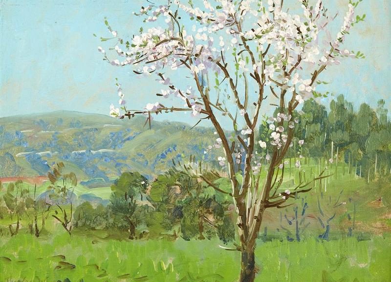 哇!我被眼前的景象惊到:河边那棵杏树,不知何时绽出一树的花来,远看如一片云歇在枝头,奶白中透着绯红,在灰褐远山跟微绿原野的映衬下,美得不可方物。