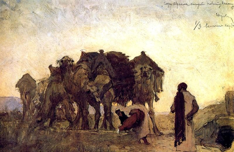 哥哥、父亲安排了丰盛的晚宴招待异乡人,或者叫他亚伯拉罕的老仆人吧。亚伯拉罕是爷爷拿鹤的兄弟,他的儿子以撒比我生得晚,现在还没娶妻呢。亚伯拉罕要老仆人为以撒找一个本地本族的女子为妻。老仆人在井边,为的正是等一个给他水喝,又打水给骆驼喝的女子。那是老仆人向神求的兆头,这样做的女子,就是神给以撒所定的妻子。
