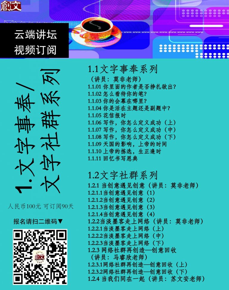从一名作者,文字老师,文字牧者,到带领创文在整个神国文字事奉上推广,可以想见,文字视野也从一篇文章,一堂课,到整个神国的文字需要……在不断地被扩大与拓深。