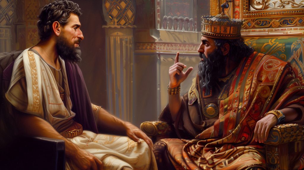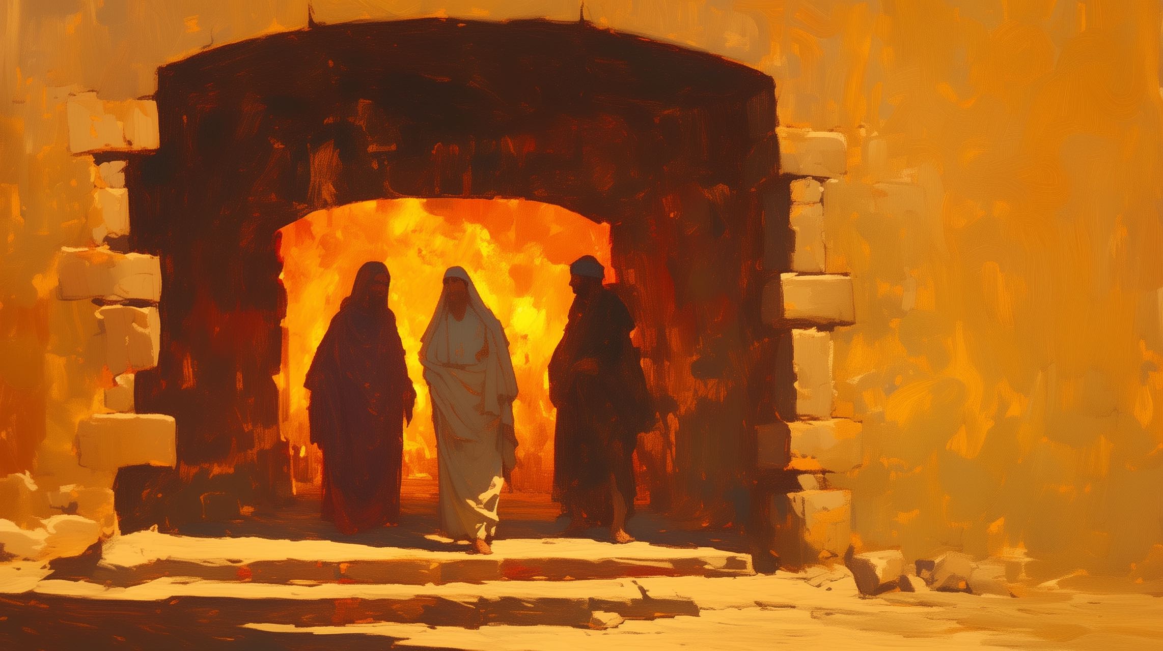 “愿王万岁!您曾降旨,一旦乐器声音响起,便跪拜金像,违者以火刑严惩……现在,王所派管理巴比伦省的犹大人沙得拉、米煞、亚伯尼歌,他们不侍奉王的神,也不敬拜金像……”几个身穿迦勒底服饰的人前来通报。