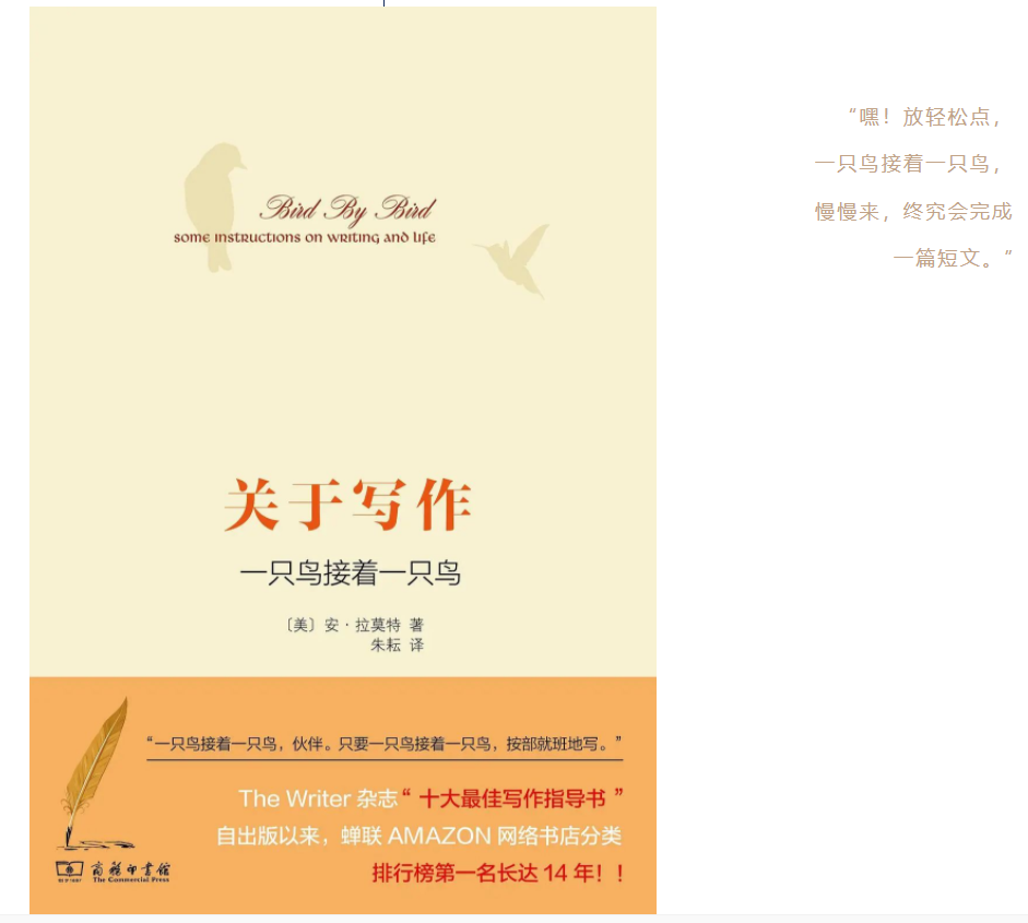很多年前,安的哥哥10岁,在他那个年级里有件大事,就是要交一份有关鸟类的报告。尽管老师很早就给了相关指示和资料让学生准备,他哥哥却在交作业期限前一天才看着桌上的这些作业、书籍,不知如何下手,一脸快哭的模样。身为作家的父亲坐在儿子身边,把手放在他的肩膀上告诉他:“一只鸟接着一只鸟。你先选择一只鸟,写一两句有关这只鸟的事,然后再写一只鸟,写两句有关那只鸟的事。不用管其他的,只要专注在眼前当下这只鸟,写两句话就可以了。”