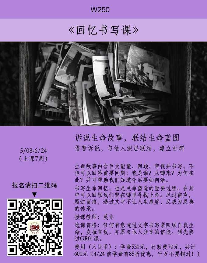 今年春天我接触了创文,从老师们的教导中,我惊见遗失的那一角!虽为文字事奉而进入创文学习,却在灵命上经历更新和造就。就这样一路修到秋季班《回忆书写课》招生,我充满期待地报名,盼望透过这门课,将更多缺失的片段找回,拆掉炸弹,让过去,好好过去。